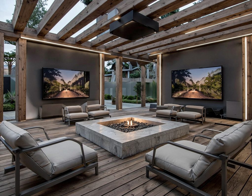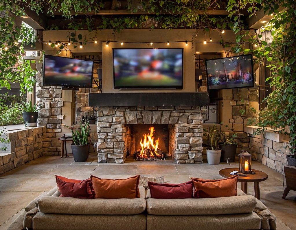 Professional installation of modern lighting, outdoor TVs, ceiling fans, and electrical outlets for convenience.